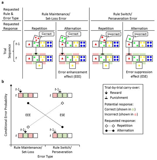 Exemplary sequences of two consecutive trials (i.e., t − 1, t), separately for requested rule maintenance and rule switch sequences (as indicated via positive and negative feedback on trial t − 1, respectively), and for requested response repetition/alternation sequences. Note that ‘odd’ errors on trial t were excluded from consideration (see Section 2. Materials and Methods for definition). (a). Left panels. ‘Correct’ feedback in response to sorts according to the Shape rule, which occur on trial t − 1, signal that the currently applied rule should be maintained on the upcoming trial; subsequent rule switches on trial t are hence erroneous because they obey either to the Number rule or to the Color rule. Note that these types of errors are traditionally considered as set-loss errors. Right panels. ‘Incorrect’ feedback in response to sorts according to the Number rule, which occur on trial t − 1, signal that a rule switch is requested on the upcoming trial (to obey either to the Shape rule or to the Color rule); maintenance of the currently applied rule on trial t would hence be erroneous. Note that these types of errors are traditionally considered as perseveration errors. The black symbols (arrows, cul-de-sac signs) illustrate potential response-specific carry-over from trial t − 1 to trial t, i.e., reward in case of ‘Correct’ feedback, or punishment, in case of ‘Incorrect’ feedback. (b). Further clarification of the response-level analysis of performance on the WCST (see Section 1. Introduction for details). Conditional Error Probability: Probability of an error given feedback type (‘correct’, ‘incorrect’) and response demand (repetition, alternation).
