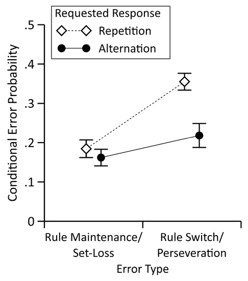 The newly derived M-WCST conditional error probabilities (see Section 2.2. Materials and Design and Figure 1a) were subjected to a two-way repeated measures analysis of variance (ANOVA) with the factors rule sequence (requested rule maintenance/switch) and the response sequence (requested response repetition/alternation). The level of significance was set to p < 0.05. We also conducted a Bayesian ANOVA to quantify evidence in favor of each model that was considered in the ANOVA in addition to traditional null hypothesis significance testing [44]. All of the analyses were computed while using JASP version 0.8.5.1 [45]. Default settings of JASP were used for the Bayesian ANOVA. In addition to posterior probabilities, we reported logarithmized Bayes factors (logBF), which quantify the support for a hypothesis over another. For example, logBF10 = 2.30 indicates that the alternative hypothesis is approximately ten times more likely than the null hypothesis, as the corresponding Bayes factor is exp(logBF10) = 10.