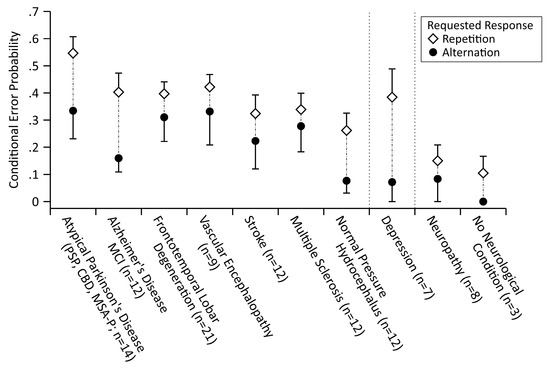 Mean conditional (perseveration) error probabilities in response to a requested rule switch (i.e., following negative feedback, which had been received on the previous trial), separately for the two types of response sequence (requested response repetition/alternation) and as a function of diagnostic entities (atypical Parkinson’s disease (progressive supranuclear palsy (PSP), cortico-basal degeneration (CBD), multi-system atrophy-Parkinsonian subtype (MSA-P)), (early) Alzheimer’s disease/mild cognitive impairment, frontotemporal lobar degeneration, vascular encephalopathy, stroke, multiple sclerosis, normal pressure hydrocephalus, depression, neuropathy, no neurological (or psychiatric) disease). For this analysis, n = 115 patients had sufficient data, but three patients who suffered from idiopathic Parkinson’s disease, a patient who suffered from dystonia, and a patient who suffered from multi-system atrophy-cerebellar subtype (MSA-C) were excluded from this analysis. An error-suppression effect was observed within each diagnostic entity. Error bars depict plus/minus one standard error of the mean. Conditional Error Probability: Probability of an error given negative feedback and response demand (repetition, alternation).