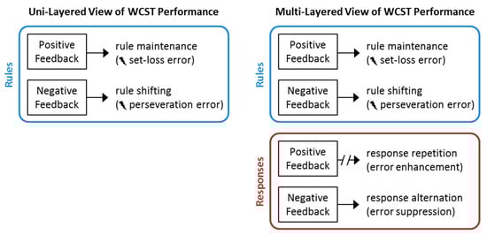 This is a behavioral investigation of WCST performance in a mixed neurological sample. We derived novel error metrics by stratifying the traditional set loss and perseverative errors. The separating rule set and response set allowed for the measurement of performance across four trial types, crossing rule set (i.e., maintain vs. switch) and response demand (i.e., repeat vs. alternate). Critically, these four trial types can be grouped based on trial-wise feedback on the t − 1 trials. Rewarded (correct) maintain t − 1 trials should lead to error enhancement when the response demands shift from repeat to alternate. In contrast, punished (incorrect) t − 1 trials should lead to error suppression when response demands shift from repeat to alternate. The results supported the error suppression prediction: An error suppression effect was observed across numerous patient samples. The error suppression rates did not correlate with performance on standard neuropsychological tests. We interpret these findings as providing evidence that WCST performance is multi-layered cognitive structure, which is driven by both rule and response sets (see Figure 4). Specifically, they suggest that pure response selection behavior, before categories are considered, is particularly susceptible to punishment-based learning (i.e. feedback on incorrect responses), at least in the population of neurological inpatients. However, the absence of a non-neurological control group is a limitation of our study, as there is no evidence that what was observed is related to the presence of neurological disease. Indeed, the absence of correlation with other neuropsychological measures might suggest the opposite—that punishment-based learning is a driver of WCST performance irrespective of the nature, or indeed the existence, of brain abnormality. Here, our main argument is that our observation is in and of itself a worthwhile finding, which invites conducting (confirmatory) future research with the ultimate goal of developing a comprehensive neuropsychological task theory of the WCST.