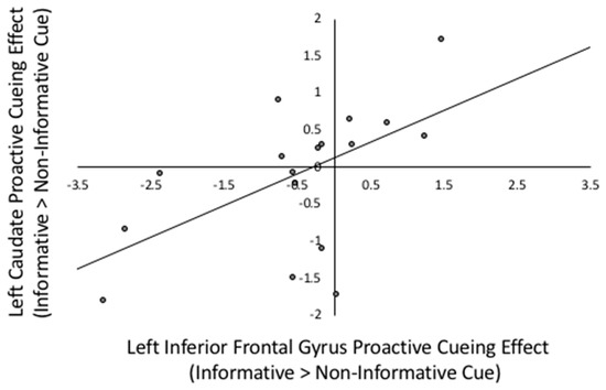 Consistent with the neural mechanisms described by Braver [26], the proactive cuing effect (informative > non-informative cues) in the left caudate nucleus was positively correlated with the proactive cuing effects in three out of four lateral prefrontal regions of interest (ROI) including the left DLPFC (r(17) = 0.561, p = 0.019), IFG(r(17) = 0.563, p = 0.019) and the right precentral gyrus (r(17) = 0.605, p = 0.010) ROIs, as well as with the right caudate nucleus (r(17) = 0.682, p = 0.003). The right caudate nucleus was only significantly correlated with cuing in the left DLPFC (r(17) = 0.559, p = 0.020). Each of these results was significant after the FDR multiple comparison correction was applied (uncorrected p < 0.023). To illustrate, the relations between cueing effects in the left IFG and left caudate nucleus are depicted in Figure 3.