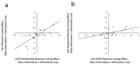 (a) Scatterplot between left Orbitofrontal reactive cueing effect and ACC reactive cueing effect. Reactive cueing effect is the beta weight difference between non-informative cued > informative cued in Execute phases, r(17) = 0.814, p < 0.001. (b) Scatter plot between left DLPFC reactive cuing effect and left temporal reactive cueing effect, r(17) = 0.614, p = 0.009.