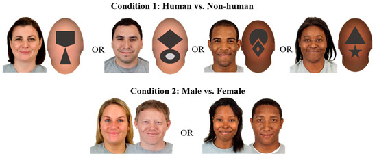 Images of human faces were chosen from the Chicago Face Database [62], with adults between 18- and 40-years-old. Faces were categorized based on race, gender, and rated for friendliness and attractiveness. All faces used in this study expressed a happy closed mouth smile. Half of the infants saw faces that were Caucasian, and the other half of infants saw African American faces. This stimulus difference was included with consideration of previous face perception findings that race can intersect with an infant’s processing of male and female faces [20,21,23,24]. A final set of 6 male and 6 female Caucasian and African American faces were used (see Figure 1). Faces were selected based on facial expression clarity, visibility of the eyes, and no apparent makeup, body piercings, or physical abnormalities. All male faces included in the final set had a hair length that did not extend past their ears, and most female faces had a hair length that reached to at least their chin. Three non-human-shaped faces were created in Photoshop CS5 12.0.x64 and Powerpoint (see Figure 1). The non-human-shaped stimuli were edited versions of the human faces. In Photoshop, the internal features of a Caucasian and an African American face were smoothed over and replaced with 2 non-human shapes (e.g., a triangle and a star). Three Caucasian non-human-shaped stimuli were used with infants who saw Caucasian faces and 3 African American non-human-shaped stimuli were used with infants who saw African American faces.