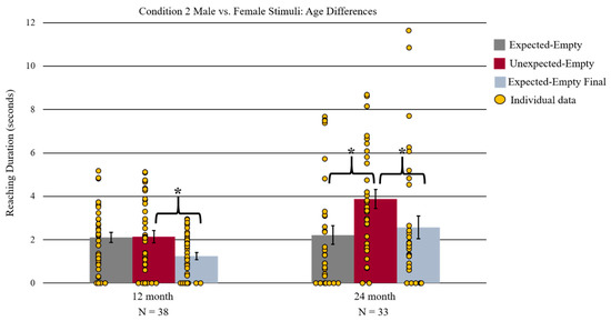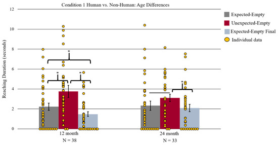 Depiction of the age separated two-way mixed measures ANOVA. Twelve-month-old infants reached significantly longer during the unexpected-empty relative to the expected-empty and expected-empty final outcomes. Additionally, infants showed longer reaching during the expected-empty than during the expected-empty final outcome. Twenty-four-month-old infants reached significantly longer during the unexpected- than during the expected-empty final outcome. Yellow circles represent each individual reaching data point. Error bars represent the standard error of the mean. The solid line represents a significant difference, which was not maintained following Bonferroni correction; * represents p < 0.05 Bonferroni corrected.