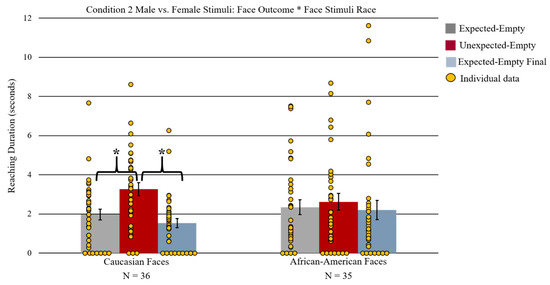 Depiction of the significant interaction of face outcome by face stimuli race found for the 24-month-old reaching duration. Infants reached significantly longer during unexpected-empty outcome than during the expected-empty outcome for Caucasian face stimuli but not for African American stimuli. Infants reached significantly longer during unexpected-empty versus expected-empty final outcome for African American face stimuli. Yellow circles represent each individual reaching data point. Error bars represent the standard error of the mean; * represents p < 0.05 Bonferroni corrected.