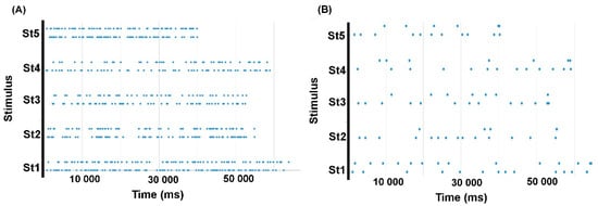 (A) Stimulus-specific global arrays, combining all segmentation models for each utterance (St1-5: Stimulus 1–5; lower line: delexicalized; upper line: natural). Dots represent virtual segmentation points; (B) Example of a segmentation maps (Participant 01) containing actual segmentation marks for each of the five stimuli in natural speech versions (above) and delexicalized ones (below, speech prosody instruction in this case).