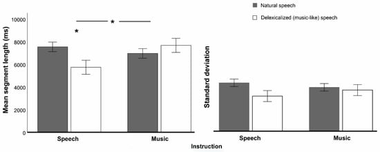 Delexicalization and instruction effects on the mean (left) and standard deviation (right) of segment length. Participants under the speech instruction decreased segment length in delexicalized versions, while those under the music instruction did not show any change. The standard deviation (variability) decreased in delexicalized versions for both instruction levels. Vertical bars represent the standard error of the mean.