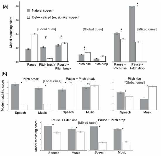 When the three-way interaction was broken down into the seven models (Figure 3A,B), the pattern of effects and interactions (delexicalization x instruction) was indeed heterogeneous, and it did not overlap with the associated cue types (local, global, mixed). Pauses alone (local cue, p >0.45, η2p = 0.008) and Pitch drops (global, p >0.95, η2p = 0.000) showed non-significant interactions between delexicalization and instruction. For these, delexicalization increased model matching in both instruction levels (main effect of delexicalization on matching with Pauses: F(1,68) = 378.96, p <0.001, η2p = 0.85; on matching with Pitch drop: F(1,68) = 19.16, p <0.001, η2p = 0.22). Significant delexicalization x instruction interactions showed up for Pitch breaks (local cue, F(1,68) = 5.15, p = 0.026, η2p = 0.07), Pitch rise (global, F(1,68) = 48.89, p <0.001, η2p = 0.42), Pause + pitch rise (mixed, F(1,68) = 4.56, p = 0.036, η2p = 0.06), and Pause + pitch drop (mixed, F(1,68) = 11.31, p = 0.001, η2p = 0.14). The interaction for Pause + pitch break was marginal (local cue, F(1,68) = 3.07, p = 0.084, η2p = 0.04). All these interactions indicate different expectations for music compared to the speech prosody instruction.