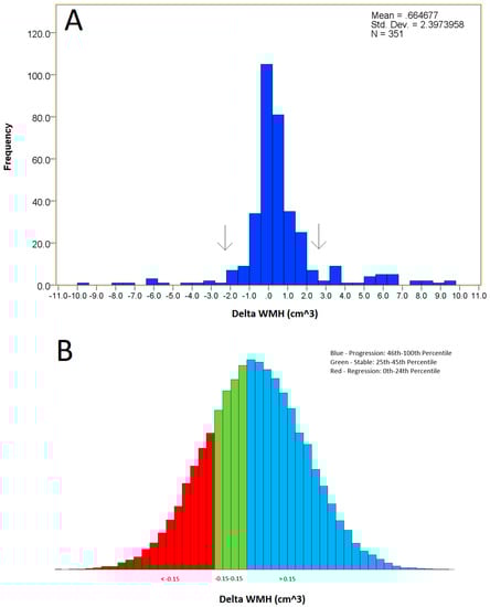 We used the conventional net change in the WMH between the baseline and the follow-up visits together with the percentile approach to categorize the dynamic changes into three groups (progression, stable, and regression). We found that about 25.5% of study participants showed WMH regression, which is similar to the 11.3% and 21.5% reported by others [,]. In addition, 19.1% of the cohort remained stable and 55.4% showed WMH progression over two years. These data add to the existing literature suggesting that WMH volume change is a dynamic process.