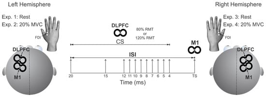- Hasan, A.; Galea, J.M.; Casula, E.P.; Falkai, P.; Bestmann, S.; Rothwell, J.C. Muscle and Timing-specific Functional Connectivity between the Dorsolateral Prefrontal Cortex and the Primary Motor Cortex. J. Cogn. Neurosci. 2013, 25, 558–570. [Google Scholar] [CrossRef] [PubMed]