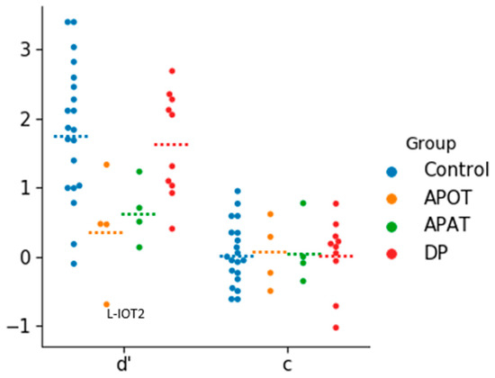 The categorical scatter plot of d’ and c values. Dotted lines represent the mean for each group. APOT = acquired prosopagnosia with occipitotemporal lesions; APAT = acquired prosopagnosia with anterior temporal lesions; DP = developmental prosopagnosia.