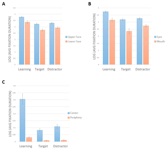 The control’s average scanning duration (log-transformed) for the learning, target, and distractor trials comparing upper versus lower face (A), eyes versus mouth (B), and central versus periphery (C). All error bars show the standard error of the mean.