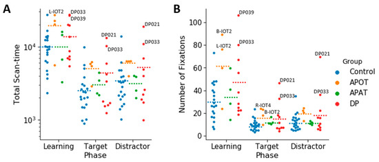 A categorical scatter plot of log(total scan-time) per face (A), and the number of fixations per face (B) in the Learning, Target and Distractor phases. The dotted lines represent the mean for each condition. Labeled subjects are abnormal by the single-subject analysis. APOT = acquired prosopagnosia with occipitotemporal lesions; APAT = acquired prosopagnosia with anterior temporal lesions; DP = developmental prosopagnosia.