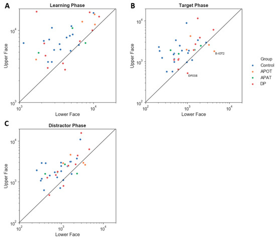 The scatter plot of the log (scanning duration) on the Upper versus Lower face, for the Learning (A), Target (B) and Distractor phases (C). The straight line shows an equal duration of fixation on the Upper versus Lower face. Points above the line indicate longer fixation duration on the upper face. Labeled subjects are abnormal by the single-subject analysis. APOT = acquired prosopagnosia with occipitotemporal lesions; APAT = acquired prosopagnosia with anterior temporal lesions; DP = developmental prosopagnosia.