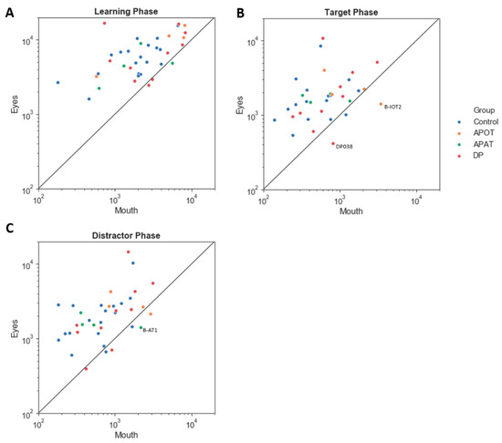 The scatter plot of log (scanning duration) on the eye versus mouth region, in the Learning (A), Target (B) and Distractor phases (C). The straight line shows an equal duration of fixation on the eye versus the mouth; points above this indicate more fixation time on the eyes. Labeled subjects are abnormal by the single-subject analysis. APOT = acquired prosopagnosia with occipitotemporal lesions; APAT = acquired prosopagnosia with anterior temporal lesions; DP = developmental prosopagnosia.