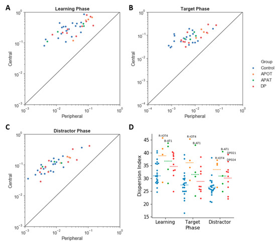 The scatter plot of log (scanning duration) on the central versus peripheral region, in the Learning (A), Target (B) and Distractor phases (C). The straight line shows equal duration of fixation on the center versus the periphery; points above this indicate more fixation time on the center. Categorical scatter plot of the dispersion index (D) in the Learning, Target and Distractor phases. Dotted lines represent the mean for each condition. Labeled subjects are abnormal by the single-subject analysis. APOT = acquired prosopagnosia with occipitotemporal lesions; APAT = acquired prosopagnosia with anterior temporal lesions; DP = developmental prosopagnosia.