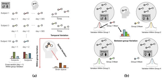 A central role statistical science plays in brain studies is the analysis of variance. First, comparing between-group variation with the within-group variation (of the edges), one can test the heterogeneity of edge strength across various groups. Perhaps one of the simplest examples is the one-way ANOVA F-test statistic, which is defined as the ratio of between-group variance over within-group variance: hence the larger the F-test statistic, the edges are more dissimilar between-group relative to within-group. Such a comparison also lays the foundation for the intraclass correlation (ICC): the larger an ICC, the edges are more similar within-group as compared to between-group. Additionally, the within- and between- group variations form the bases for brain data decomposition, where data derived from various experimental conditions and heterogeneous populations can be separated into population-specific components that envisage biological attributes shared by the whole population, and subject- or group-specific components that distinguish a subject or a sub-group (see Section 2.1.4) [3,4]. Second, the spatial variation, observed either at rest or under a task such as seeing a picture, highlights the areas of the brain that are more active during rest (e.g., see [5]) or are associated with the task (e.g., see [6]). Third, if the edge strength between brain areas co-varies with a behavioural or cognitive trait (e.g., fluid intelligence or cognitive ability), they are potentially modulating this trait (e.g., see [7,8]). Meanwhile, abnormal variability observed in focal brain regions suggests potential brain illness: a chief element in brain disorder diagnosis (e.g., see [9,10]). Finally, tracing temporal variation in health and disease helps to monitor brain development and brain disorder progress (e.g., see [11,12]).