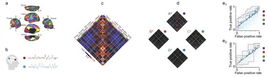 Figure 2. Using predictive models to uncover distinctive brain states and areas to diagnose psychosis. (a) The functional network organization of the human cerebral cortex is revealed through intrinsic functional connectivity. Colours reflect regions estimated to be within the same network determined based on the 17-network solution from Yeo et al. [17]. The map is displayed for multiple views of the left hemisphere in Caret PALS space [18]. (b) A schematic representation of time courses obtained from two brain regions. (c) Correlation matrices (a measurement of functional connectivity) are computed from time courses across regions. Values reflect z-transformed Pearson correlations between every region and every other region. DorsAttn indicates dorsal attention, Sal salience, SomMot somatomotor, and VentAttn ventral attention. (d) Brain states exhibit hierarchical features across distributed networks. Correlation matrices for four states (arranged using k-means clustering) are shown for each region. (e) Specific brain states are predictive of distinct clinical symptoms in novel individuals. (e1) State B4 uniquely predicted the presence of active psychosis in patients with psychotic illness. Results from a leave-one-subject-out cross-validation elastic-net logistic regression analysis comparing predicted and observed psychotic symptoms (n = 91). The displayed area under the receiver-operating characteristic curve (AUC) reflects the scalar probability measure for each individual, predicting the likelihood of active psychotic symptoms. The blue semi-transparent lines reflect 1000 ROC curves from 1000 permutation experiments. The black dashed line indicates the mean of these 1000 curves, approximating a null curve. The purple, red, green, and orange curves correspond to states A4, B4, C4, and D4, respectively. (e2) Connectivity models defined on training data predict the presence of active psychotic symptoms in an independent group of participants (n = 31). The displayed AUC graph reflects the scalar probability measure, predicting the likelihood of active psychosis, defined using positive edges from the initial training set without further fitting or modification, in a held-out sample of patients. The images are adapted and modified, under the terms of the Creative Commons CC BY license, from Springer Nature Communications “The human cortex possesses a reconfigurable dynamic network architecture that is disrupted in psychosis” by Reinen et al. Copyright 2018 [9].