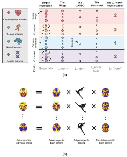 The predictive-modeling based feature selection can be further classified into two types of models. The former type consists of step-wise models that link, at each step, one feature (e.g., an edge) with an outcome variable (e.g., disease status); judging the strength of the association, the model discards (or admits) the feature. The latter type consists of predictive models in which all features are considered simultaneously; the features whose parameter estimates from the model are not significant are discarded. Regularized models, such as the Ridge, the LASSO, and the elastic-net (see Figure 3a), which shrink the estimated parameters of irrelevant features (and thus suggest removing these features in the model output), are examples of the second type [19,20,21]. The validity of the selected features is subsequently tested on novel subjects to check if they can, without further modeling, reproduce a good outcome prediction (see Figure 2d,e).
