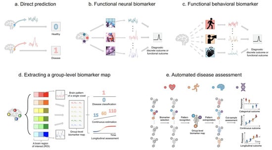 Figure 4. Using predictive models to diagnose disease, estimate disease severity, and assess disease progress. (a) A neural biomarker from a specific brain region is directly mapped to a diagnostic clinical outcome. (b) The functional neural biomarker framework. By evaluating the spatial pattern across subjects, the framework identifies multiple biomarkers related to diagnostic clinical outcomes. (c) The functional behavioural biomarker framework. When brain data is not available, behavioural data (such as physical activity, speech pattern, and hand movement) recorded semi-continuously from wearable computers serve as biomarkers. (d) Extracting a predictive map using functional behavioural biomarkers. Each box refers to a voxel; voxels with the same colour but different hues indicate the same anatomical or functional region. The coloured w 1 ,   w 2 , w n represent predictive weights for biomarkers. (e) Algorithm-based automated disease assessment. During model-building, features related to the heart (such as electrocardiogram (ECG) data), behaviours (such as physical activity measurements), the brain (such as fMRI data), and the genome (such as GWAS data) that are relevant to the outcome are selected. Subsequently, a predictive map consisting of weights across selected functional biomarkers is developed using the training sample. During the prospective testing step, the efficacy of selected features is verified by integrating the weight map with data from previously unseen individuals without further model fitting and yield a prediction for each subject. At a cross-section, the model yields one predicted outcome (binary disease status or continuous disease severity) per subject. Longitudinally, the model yields one predicted outcome per subject at every time point.