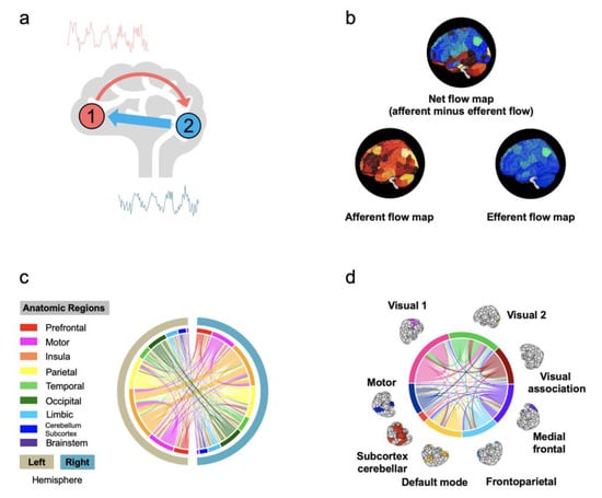 Figure 5. Information flows in the human brain. (a) Estimating information flows from a brain area 1 to another area 2—and from area 2 back to 1. This can be done using a statistical framework such as Granger causality analysis, dynamic causal modeling, and information theory (see Section 2.3). The direction and size of the arrows indicate the directed route and the amount of neural information traveling from one brain region to another. (b) Afferent, efferent, and net information flow maps of the whole brain. The afferent flow measures the amount of information entering a particular brain area from other brain areas. The efferent flow measures the amount of information existing from a particular brain area to other brain areas. The net information flow quantifies the difference between the two. (c) Average information flow between 18 anatomic regions. The 18 regions are organized based on a 268-node functional atlas. Average information flow is defined as the total amount of information flow from each anatomic region divided by the number of nodes in the region. The colour of the edge indicates the origin of the flow. For example, the pink curved line crossing the circle starting from the lower left (pink bar) to the top right (light orange bar) indicates information flow from left motor region to right insula region. (d) Average information flow between eight functional networks. The edges are now visualized on eight functional brain networks. The images are adapted and modified, under the terms of the Creative Commons CC BY license, from Scientific Reports “Resting-state brain information flow predicts cognitive flexibility in humans” by Chén et al. Copyright 2019 [8].