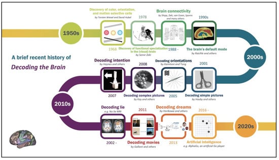 Figure 6. A timeline representing a few important discoveries in brain decoding during the past half-century [2,5,6,42,44,46,47,49,50,51,52].