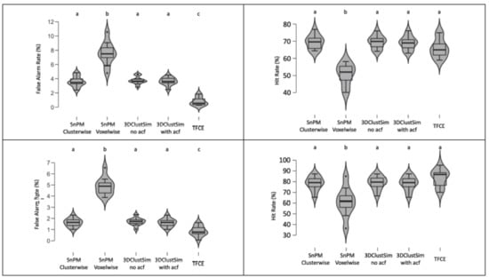 Violin plots of calculated false alarm and hit rates in five different conditions. (Top-left) Moral psychology fMRI false alarm rate. (Top-right) Moral psychology fMRI hit rate. (Bottom-left) Working memory fMRI false alarm rate. (Bottom-right) Working memory fMRI hit rate. Conditions that did not produce a significantly different false alarm or hit rate compared with each other are represented with the same letter. The p-value threshold, p < 0.05, and Bayes factor threshold, 2 log BF = 2, were applied.