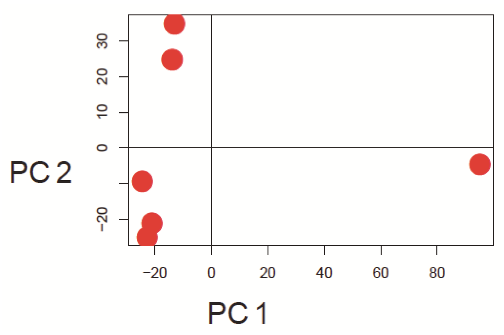 Principal component analysis was performed using the pcaMethods package. The figure depicts the first versus the second principal component in a scatter plot. There are two clusters and one potential outlier to the right in dataset GSE9801. The first PC explains 67% and the second PC explains 19% of the variance of the data.