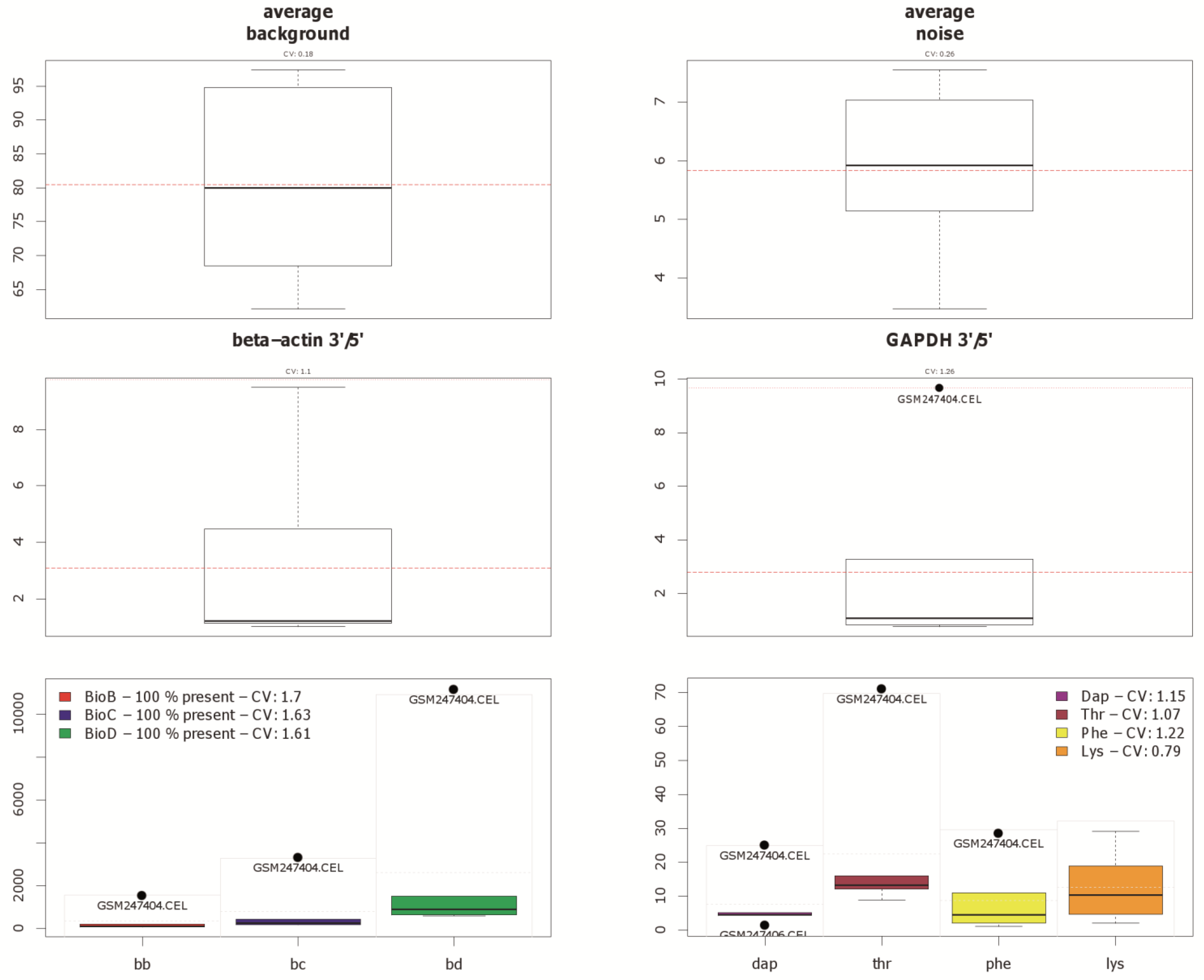Different quality measurements, which are available in the Bioconductor package yaqcaffy, shown for the example of dataset GSE9801. The first row contains two box-plots, which denote the average background and noise. The second row contains another two box-plots, showing the expression status of so called housekeeping genes. The third row contains box-plots of the Affymetrix specific spike-in and poly-A controls. Note that array GSM247404 is highlighted as potential outlier by black dots. Array GSM247406 is also flagged as outlier in the dap poly-A control, as seen at the bottom right.