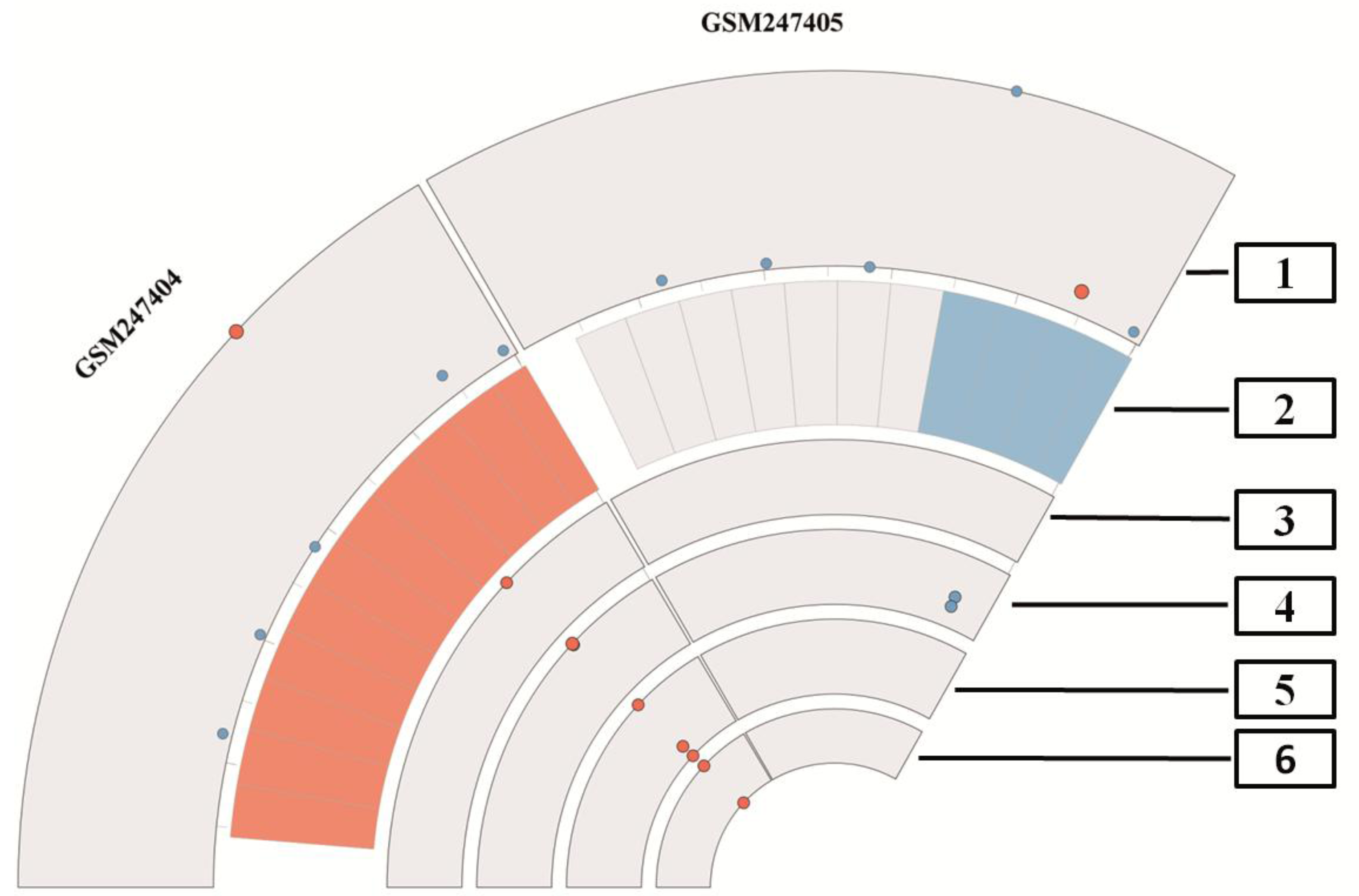 Plot of the different quality measurements, which are shown in Figure 1, Figure 2, Figure 3 of the dataset GSE9801 combined with Circos. The outer rim depicts the first principal component, which shows the actual array in red. The second rim displays the result of RNA degradation assessment. Here the red tiles present high values and the blue tiles denote low values of degradation. In addition, white tiles show medium degradation. The next four rims present outliers based on different quality control levels, first average noise and background, second outliers in the level of housekeeping genes and lastly two rims, which are showing outliers in the control spike-in probes. The index in the figure denotes: 1 = first principal component. Note that the actual array is presented as a red dot for better visualisation. 2 = RNA degradation, 3 = background and noise, 4 = β-Actin and GADPH, 5 = internal spike-in probe calls, 6 = poly-A controls. Note that array GSM247404 presents outliers on each level, even when the scores of the first principal component clusters are apart. In contrast to that, the array GSM247405 depicts inconspicuous values for almost all quality measurements, even GADPH and β-Actin shown on the fourth level in blue appear to be of good quality.