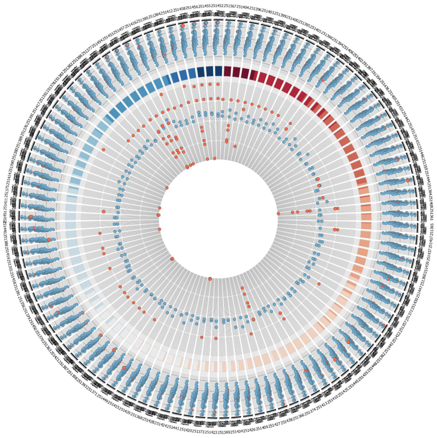 - Krzywinski, M.; Schein, J.; Birol, I.; Connors, J.; Gascoyne, R.; Horsman, D.; Jones, S.J.; Marra, M.A. Circos: An information aesthetic for comparative genomics. Genome Res. 2009, 19, 1639–1645. [Google Scholar] [CrossRef]