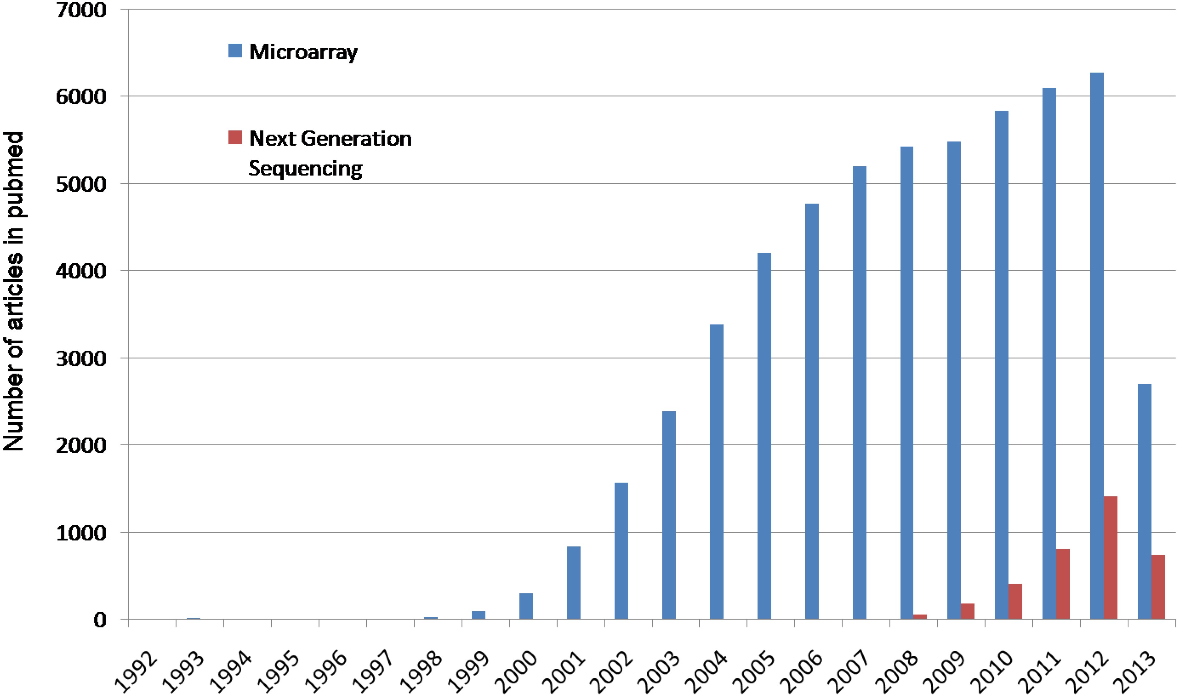 Graph indicating the number of articles in PubMed including one of the two keywords “microarray” or “next-generation-sequencing” in their articles.