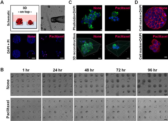 Schematic illustration and image analyses of hydrogel microwell arrays. (A) Cancer cell aggregates within microwells and their collection for subsequent expression analyses using a microinjector depicted by bright field microscopy (top panel). Confocal microscopy of four cell aggregates grown over 96 h within microwells (100 × 50 µm) ± paclitaxel treatment (100 nM); nuclei stained blue with DAPI; dead cells stained red with PI (bottom panel). Scale bars, 30 µm. (B) Time-lapse microscopy of cell aggregation ± paclitaxel treatment was performed over 96 h within microwells. Scale bars, 100 µm. (C) Confocal microscopy of cell aggregates grown over 96 h within microwells ± paclitaxel treatment and 3D reconstructions using Imaris; F-actin filaments stained green with Alexa488-conjugated phalloidin; nuclei stained blue with DAPI. Scale bars, 10 µm. (D) Confocal microscopy of the morphological marker N-cadherin in cell aggregates ± paclitaxel treatment; N-cadherin stained red using a respective primary and secondary Alexa555-conjugated IgG; nuclei stained blue with DAPI. Scale bars, 10 µm.
