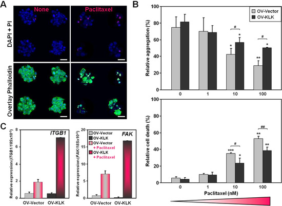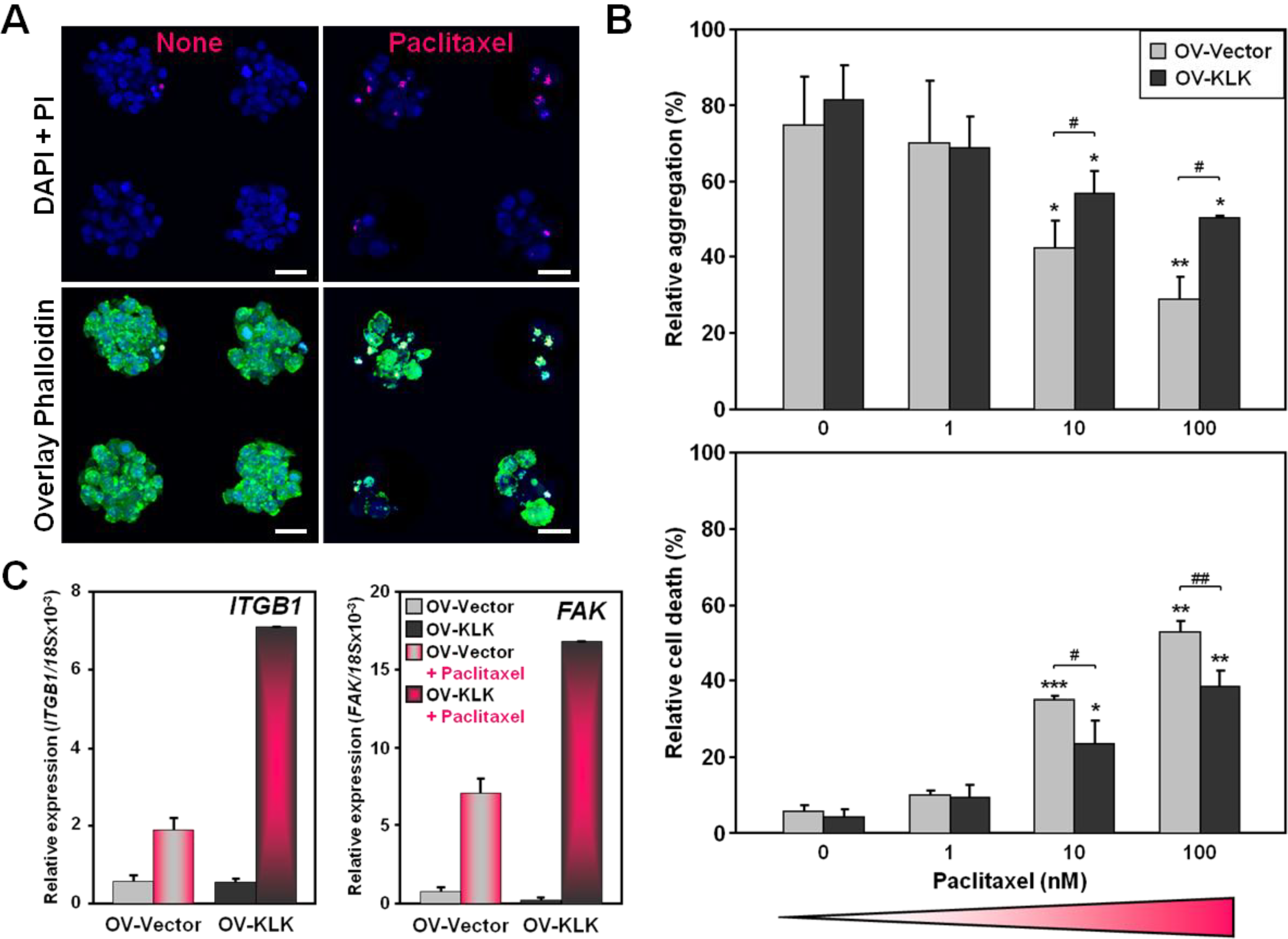 Cell aggregation, survival and gene expression upon KLK expression and paclitaxel treatment. (A) Confocal microscopy of four cell aggregates grown over 96 h within microwells (100 × 50 µm) ± paclitaxel treatment (100 nM); nuclei stained blue with DAPI; dead cells stained red with PI (top panel); overlaid with Alexa488-conjugated phalloidin to stain F-actin filaments, with dead cells appearing yellow (bottom panel). Scale bars, 30 µm. (B) OV-Vector and OV-KLK cell aggregates were grown over 96 h within microwells and treated with increasing concentrations of paclitaxel (0, 1, 10, 100 nM). Both OV-Vector/OV-KLK cells grew less aggregates at higher paclitaxel concentrations (10, 100 nM) compared to a lower paclitaxel dose (1 nM) and non-treated controls (top panel). Cell death was increased at higher paclitaxel concentrations (10, 100 nM) compared to a lower paclitaxel dose (1 nM) and non-treated controls (bottom panel; n = 3; SEM; * P < 0.05; ** P < 0.01; *** P < 0.001). OV-KLK cells formed more aggregates and showed less cell death at higher paclitaxel concentrations (10, 100 nM) than OV-Vector cells (n = 3; SEM; #: P < 0.05; ##: P < 0.01). (C) Administration of paclitaxel (100 nM) was reflected in increased ITGB1 and FAK levels in both OV-Vector/OV-KLK cell aggregates, with an upregulation upon KLK expression.