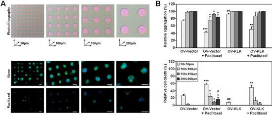 Within these bioengineered microwells, the formation of cell aggregates was achieved in sizes ranging from 50–200 µm. Similar aggregate sizes are described in experimental and clinical samples [35,55,56,57] showing a high cell viability in combination with KLK expression, and the results presented in this study are in line with our former reports [25,26]. Paclitaxel treatment revealed that the aggregate area but not aggregate number was reduced, further corroborating the existence of survival-promoting factors, such as integrins, and multi-cellular-mediated drug resistance mechanisms in ovarian cancer cells [48]. A similar bioengineered approach to the one described here has been used to control the size and shape of embryonic bodies employing microwells of varying diameters ranging from 40–150 µm and heights of 20–35 µm and has proven its potential to investigate differentiation of embryonic stem cells [60]. These findings indicate that hydrogel microwell arrays can be used to control cell aggregation, aggregate size and viability, to study factors involved in the responsiveness of different sized aggregates to anti-cancer drugs and the contribution of KLKs.