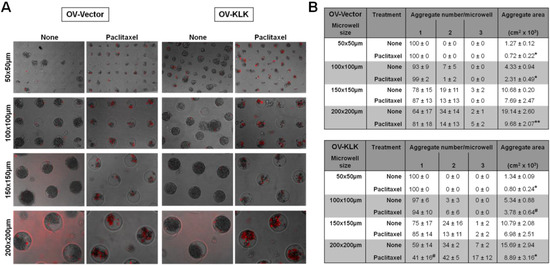 As paclitaxel is subject to multi-cellular-mediated resistance for ovarian cancer cells [48], we treated tailor-made aggregates with paclitaxel (100 nM), and analyzed the aggregation and death of both OV-Vector/OV-KLK cells relative to the total numbers (Figure 3(B)). While in the larger microwells (100–200 × 100–200 µm) complete cell aggregation (98–100%) and no cell death (0–2%) was detected, the smallest microwells (50 × 50 µm) caused incomplete cell aggregration (73–92%) and cell death (8–27%). Upon paclitaxel treatment both OV-Vector/OV-KLK cells aggregated less (42–96%) in the medium sized (100–150 × 100–150 µm) and smallest (50 × 50 µm) microwells and showed higher cell death (4–58%) rates (Figure 3(B)). Then, we analyzed the aggregate number and area in each microwell size performing time-lapse microscopy (Figure 4(A)). Both OV-Vector/OV-KLK cells formed one aggregate (1.27–1.34 × 103 cm2)/well in the smallest (50 × 50 µm) microwells, whereas in the next larger (100 × 100 µm) microwells, two aggregates (4.33–5.34 × 103 cm2)/well were formed. In the medium sized (150 × 150 µm) and largest (200 × 200 µm) microwells, three aggregates (10.68–19.14 × 103 cm2)/well were formed. Upon paclitaxel treatment both OV-Vector/OV-KLK cells formed one aggregate (0.72–0.80 × 103 cm2)/well in the smallest (50 × 50 µm) microwells, while in the next larger (100 × 100 µm) microwells, two aggregates (2.31–3.78 × 103 cm2)/well were detected. In the medium sized (150 × 150 µm) and largest (200 × 200 µm) microwells, three aggregates (6.98–9.68 × 103 cm2)/well were formed. OV-KLK cells formed larger aggregates in the second smallest (100 × 100 µm) microwells after paclitaxel treatment compared to OV-Vector cells (Figure 4(B)). These results suggest that OV-KLK cells had a higher ability to aggregate and survive with and without paclitaxel in all microwell sizes compared to OV-Vector cells. The administration of paclitaxel reduced aggregate area but not numbers compared to non-treated conditions.