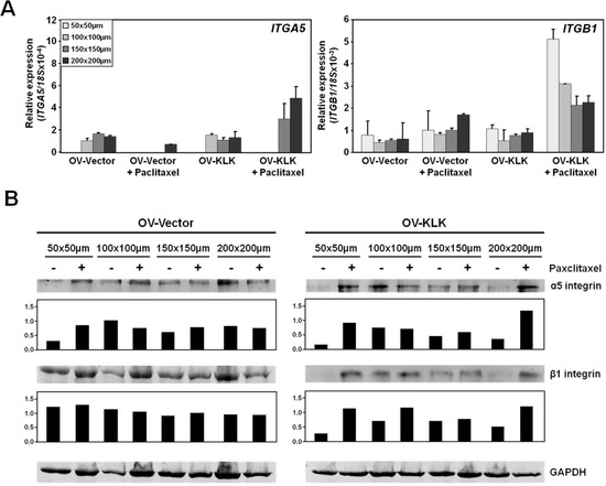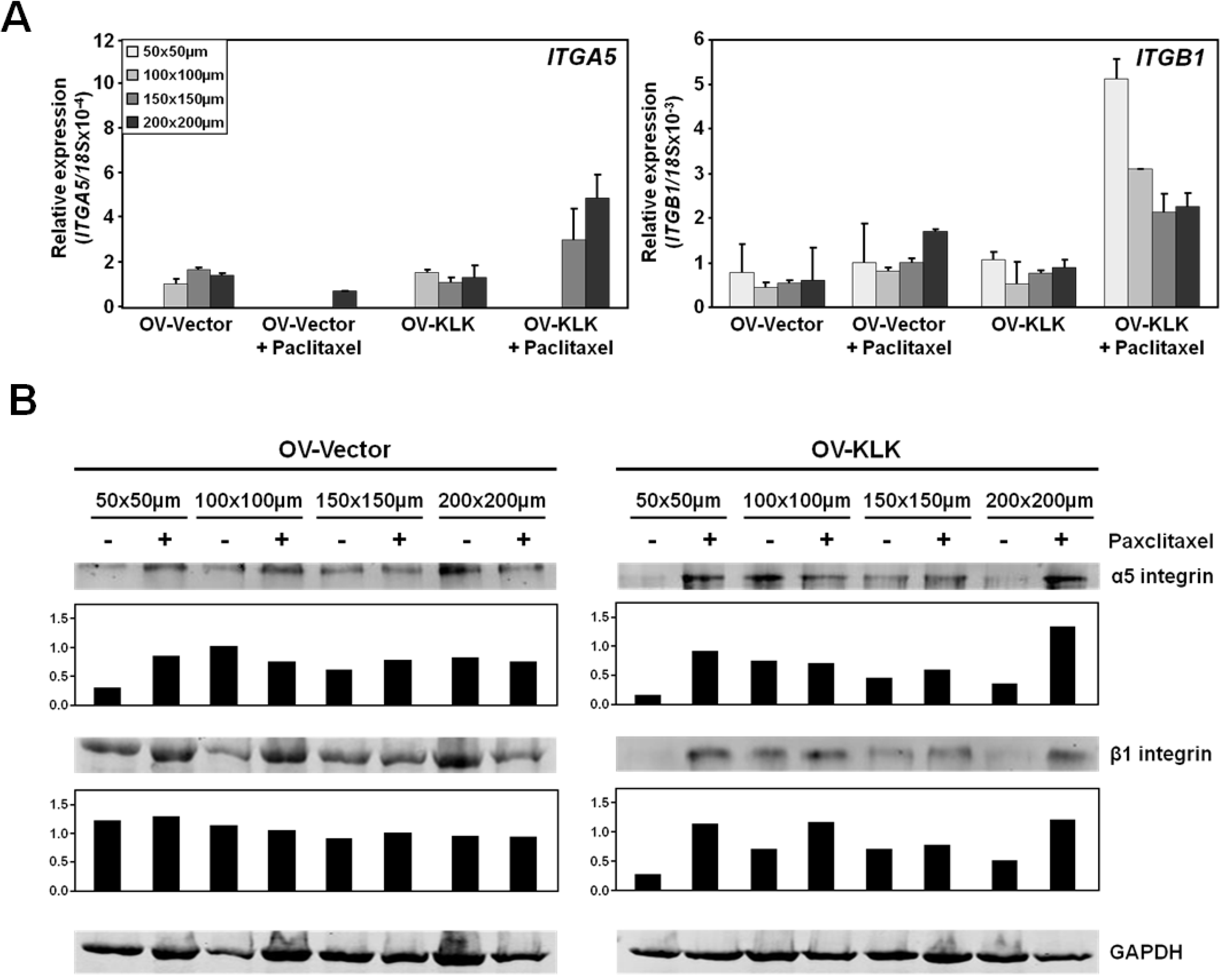Altered expression levels as a function of microwell size, KLK expression and paclitaxel treatment. (A) Levels of ITGA5 were a function of microwell size and KLK expression after paclitaxel treatment (100 nM), with highest expression in aggregates grown in the largest (150–200 × 150–200 µm) microwells. No difference in both OV-Vector/OV-KLK cell aggregates without treatment was detected. Levels of ITGB1 were enhanced after paclitaxel administration in both OV-Vector/OV-KLK cell aggregates, with highest expression on OV-KLK cell aggregates in the smallest (50–100 × 50–100 µm) microwells. No difference in both OV-Vector/OV-KLK cell aggregates without treatment was detected. (B) Western blot and densitometrical analyses demonstrated that α5 and β1 integrin expression was enhanced after paclitaxel treatment in OV-KLK cell aggregates compared to OV-Vector cells which only showed an increase of α5 integrin in the smallest (50 × 50 µm) and medium sized (150 × 150 µm) microwells.