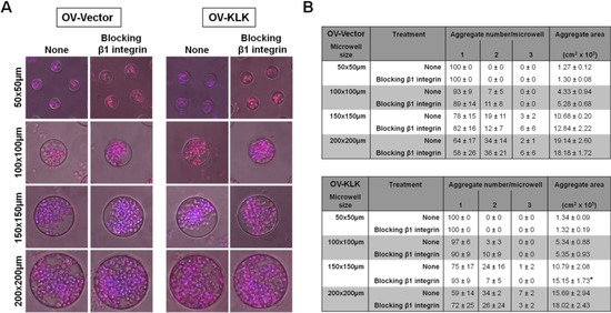 Cell aggregation in response to functional blocking of integrins. (A) Fluorescent staining of cell aggregates grown within microwells of varying sizes (50 × 50, 100 × 100, 150 × 150, 200 × 200 µm) over 96 h at the end time point of time-lapse microscopy ± inhibition of β1 integrin using a functional blocking antibody (10 µg/mL); F-actin filaments stained red with rhodamine 415-conjugated phalloidin; nuclei stained blue with DAPI. (B) Analyses of both OV-Vector/OV-KLK cell aggregate number and area revealed that with increasing microwell size (150–200 × 150–200 µm) more (up to three aggregates/microwell) and larger (12.84–18.18 × 103 cm2) aggregates were formed upon β1 integrin inhibition compared to decreasing microwell size (50–100 × 50–100 µm; 1.30–5.35 × 103 cm2), with only one to two aggregates/microwell. In the medium sized microwells (150 × 150 µm), OV-KLK cells formed significantly larger aggregates after β1 integrin inhibition compared to non-treated conditions (n = 3; SEM; * P < 0.05).