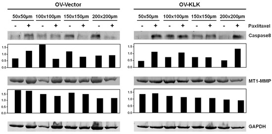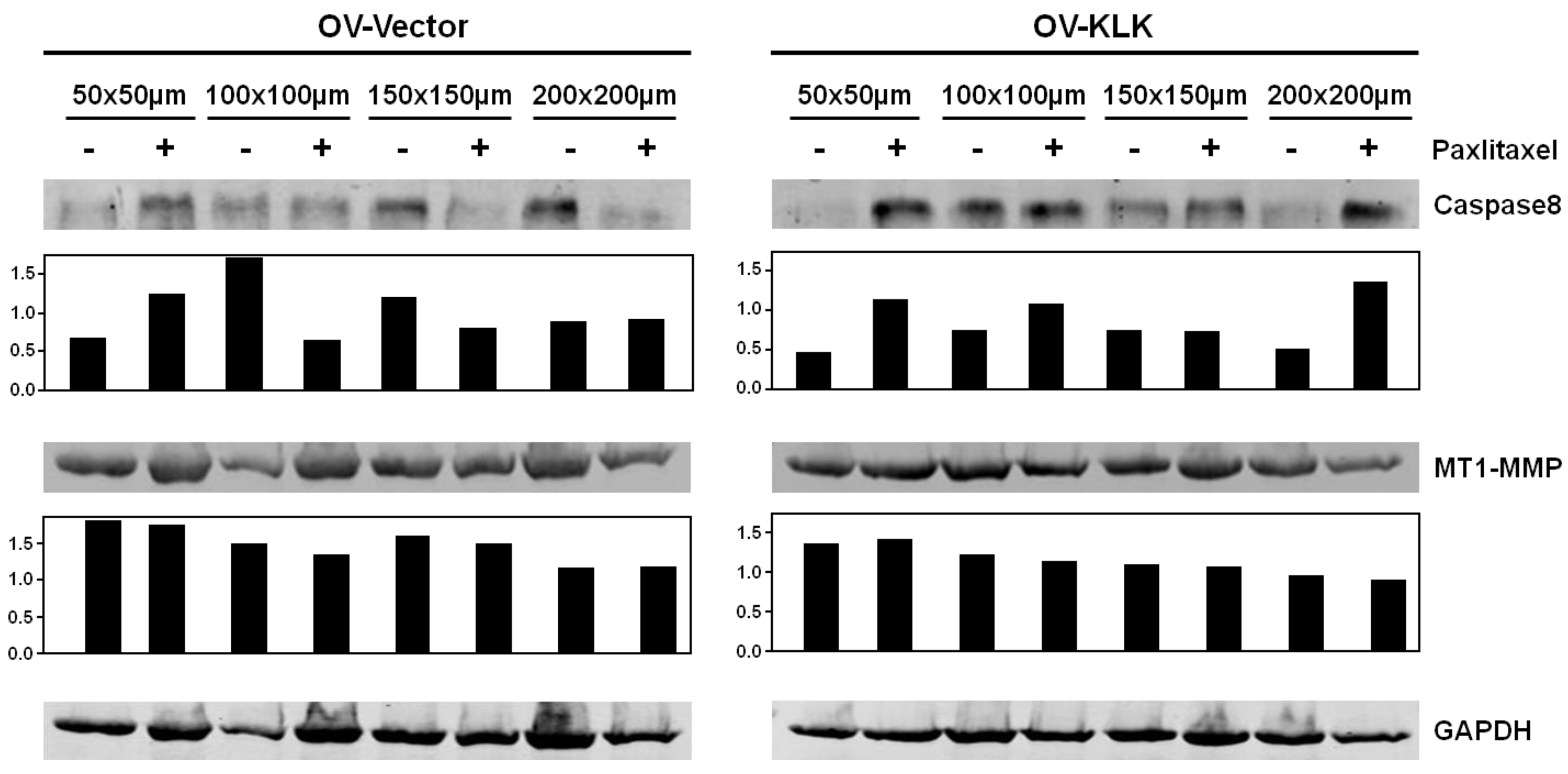 Altered caspase8 expression levels as a function of microwell size, KLK expression and paclitaxel treatment. Caspase8, indicative of apoptosis, was expressed in aggregates grown in the four different microwell sizes (50 × 50, 100 × 100, 150 × 150, 200 × 200 µm) without paclitaxel treatment and upregulated in OV-KLK cell aggregates upon paclitaxel administration. OV-Vector cell aggregates showed a downregulation of capsase8 in medium sized (100–150 × 100–150 µm) microwells upon paclitaxel treatment. Caspase8 levels did not change in both OV-Vector/OV-KLK cell aggregates in the second largest (150 × 150 µm) and largest (200 × 200 µm) microwells respectively upon paclitaxel treatment. Altered MT1-MMP expression levels as a function of microwell size. MT1-MMPwas expressed in all conditions (50 × 50, 100 × 100, 150 × 150, 200 × 200 µm) independent of KLK expression and paclitaxel treatment.