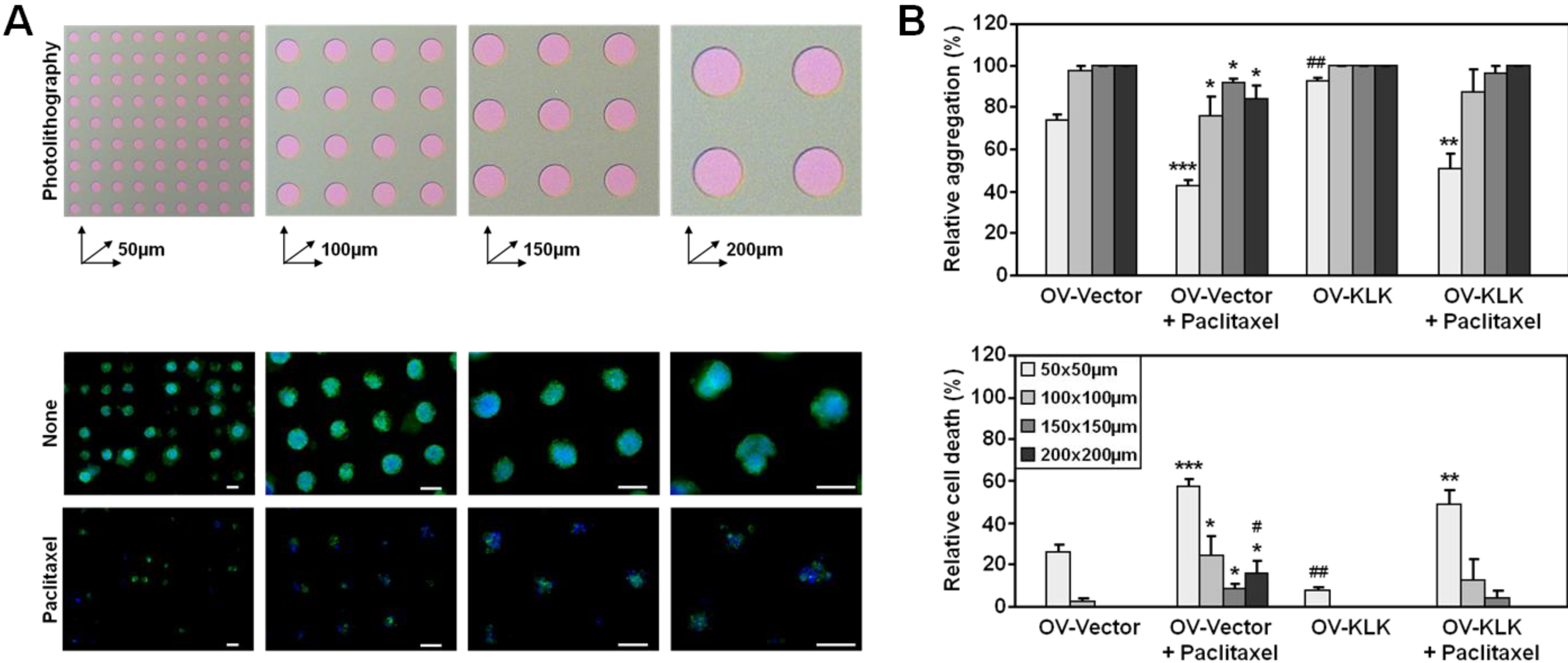 Bioengineered microenvironments have proven to be effective in screening the responsiveness of ovarian cancer cells to paclitaxel, thereby revealing increased survival rates after paclitaxel administration in 3D compared to flat cell cultures [8]. However, 3D systems which allow cell growth upon encapsulation of single cells within a hydrogel material lead often to the formation of different sized spheroids [8]. Hence, the purpose of this study was to allow OV-MZ-6 ovarian cancer cell aggregation of a defined size layered on top of polyethylene glycol-based hydrogel microwell arrays and to assess the efficacy of paclitaxel treatment dependent on aggregate size. Furthermore, we sought to determine the contribution of combined KLK4, KLK5, KLK6, and KLK7 expression and integrins to in OV-MZ-6 cell aggregation and survival upon paclitaxel treatment employing hydrogel microwell arrays as high-throughput microarray platforms [36,37] by performing time-lapse and confocal laser scanning microscopy as well as quantitative image, gene and protein analyses dependent on varying microwell and aggregate size.