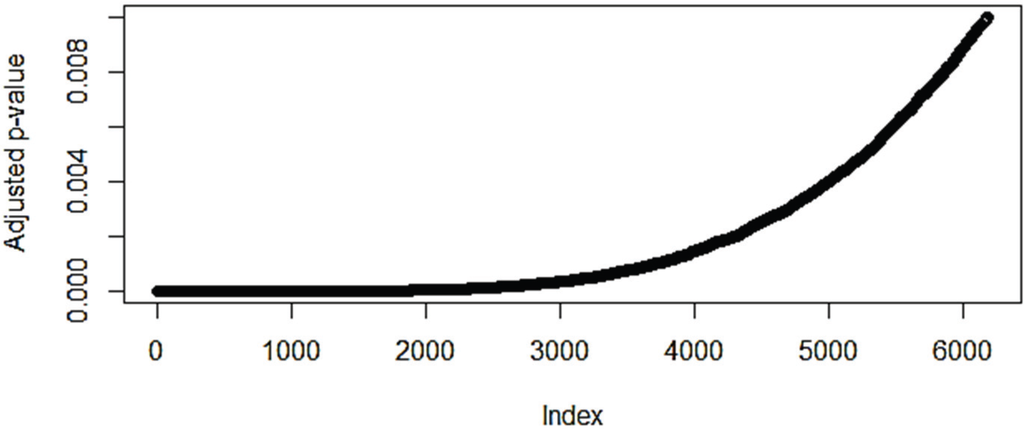 From the graph the point where the adjusted p-value starts to rise from the horizontal is around 2000 probes and so this was used as a limit on the number of differentially expressed genes in the problem datasets, except in the case of the normal vs. small-cell carcinoma comparison in dataset E‑GEOD-40725 where a cut-off of 1500 was needed.