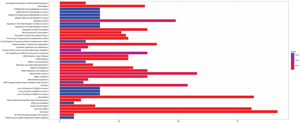 A pathway enrichment analysis of the differentially expressed genes was carried out against the Reactome pathway database using the ReactomePA module. Like gene set enrichment analysis this produces a list of key terms, in this case pathways, and a p-value for the probability that the observed distribution of expression occurred by chance. The cut-off value for the pathway p-values was chosen at 0.05. An example of the effect of normalization on the pathway analysis is given in Figure 2.