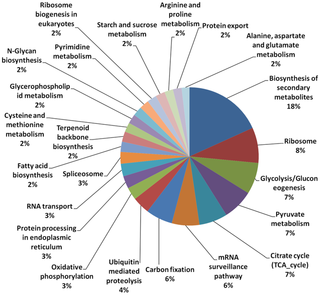 A total of 31,804 unique contigs (assembled from approximately 3 million sequenced reads from mesocarp tissue), each denoted with an individual identifier, were used for microarray probe design. From the 31,804 contigs used, 49.3% of the transcripts were annotated based on homology to those in the Uniprot database (Table 1). A total of 8.1% of the transcripts utilized also had acceptable Kyoto Encyclopedia of Genes and Genomes (KEGG) ID matches. However, when further classified based on their putative functions in different pathways, only 1.9% could be classified uniquely into defined pathways using the KEGG database. Similar figures were observed in transcriptome sequencing of microalgae, as an example, in which only about 3.9% of the annotated sequences had GO matches and 1.7% were assigned Enzyme Commission (EC) numbers [38]. The results show the incompleteness of oil palm annotation if based solely on the KEGG database. Using the KEGG classifications however, we observed that the largest group (of 18% of the KEGG classified transcripts) were putatively involved in secondary metabolite biosynthesis (Figure 1) followed by those involved in ribosome biology (8%) glycolysis, pyruvate and citrate cycles (7% in each of the three categories). Only 2% of classified transcripts were annotated as being involved in fatty acid (FA) biosynthesis, starch and sucrose metabolism, for each class. In this custom array, unique un-annotated transcripts (>50% of the contigs, data not shown) were also included to provide better coverage of the expressed genes found in oil palm mesocarp tissue.