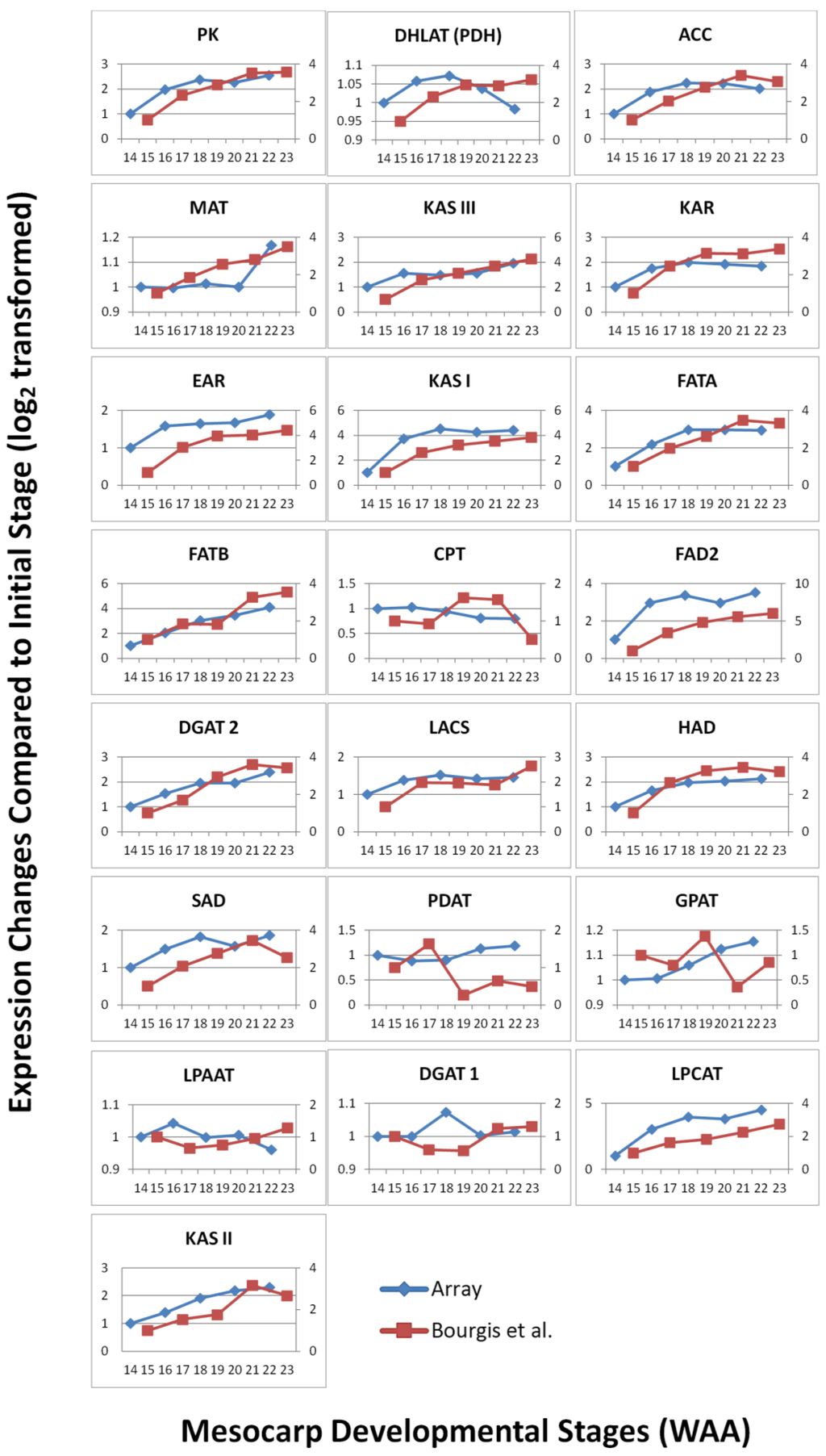Nonetheless, there are a few genes that exhibited differences in expression profiles derived using this microarray compared to the published data [4,6] such as LACS, SAD, MAT, PDH(DHLAT), CPT, GPAT, PDAT, DGAT 1, WRI1 and LPAAT (Figure 3). The differences could be a reflection of how the respective experiments were carried out and also differences in the technology used to assess the transcripts (hybridisation versus library sequencing). However, when we compared the WRI1 expression profile from the oil palm microarray here to Bourgis et al. [4] and to Tranbarger et al. [6] we observed similarity between these three different studies (Figure 5). We observed that the expression pattern of WRI1 in Bourgis et al. [4] (Figure 5A) and our microarray (Figure 5C) are similar at initial stages (12 WAA to 16 WAA) but show different trends of expression at the end of the maturation stage. However, the expression trend of WRI1 in our microarray data is similar to that reported by Tranbarger et al. [6] (Figure 5B) with an expression peak at 120 DAP (~17 WAA). The expression of WRI1 then declines as the mesocarp develops towards the maturation stage.