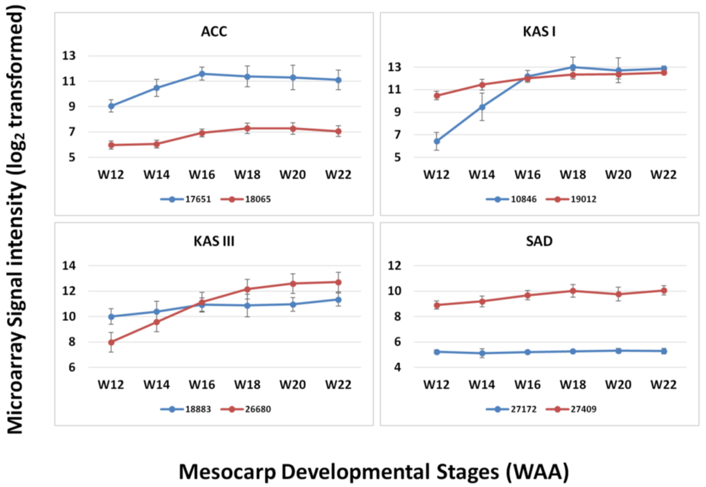 3.3. FA and TAG Biosynthesis Profiling in Oil Palm Mesocarp Development (12 WAA–22 WAA) Using the Oil Palm Mesocarp Microarray