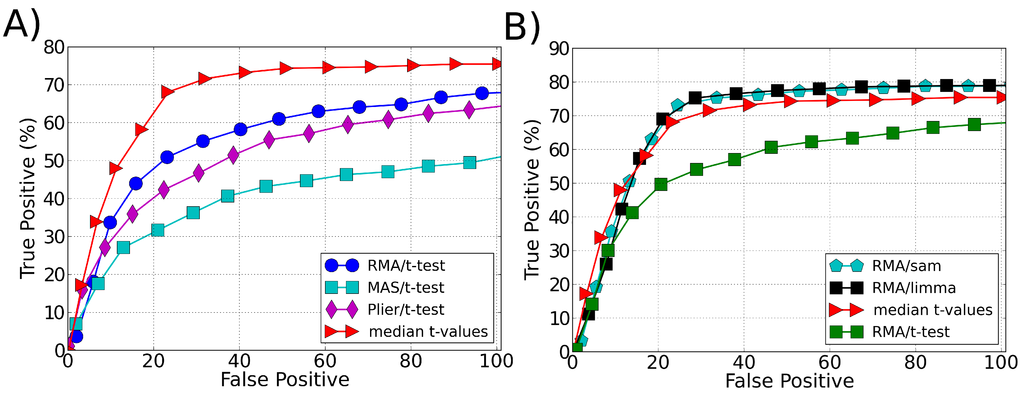 ROC curve comparing the performance (sensitivity) of different ranking methodologies in identifying differentially expressed genes in spike-in data. (A) Comparison of our approach (median t-values) with different preprocessing methods used with t-test as ranking method to select the differentially expressed genes. (B) Comparison of our approach (median t-values) with the best performance of other ranking methods: t-test, SAM and LIMMA. The best performance of t-test, SAM and LIMMA is obtained when using RMA as a preprocessing algorithm.
