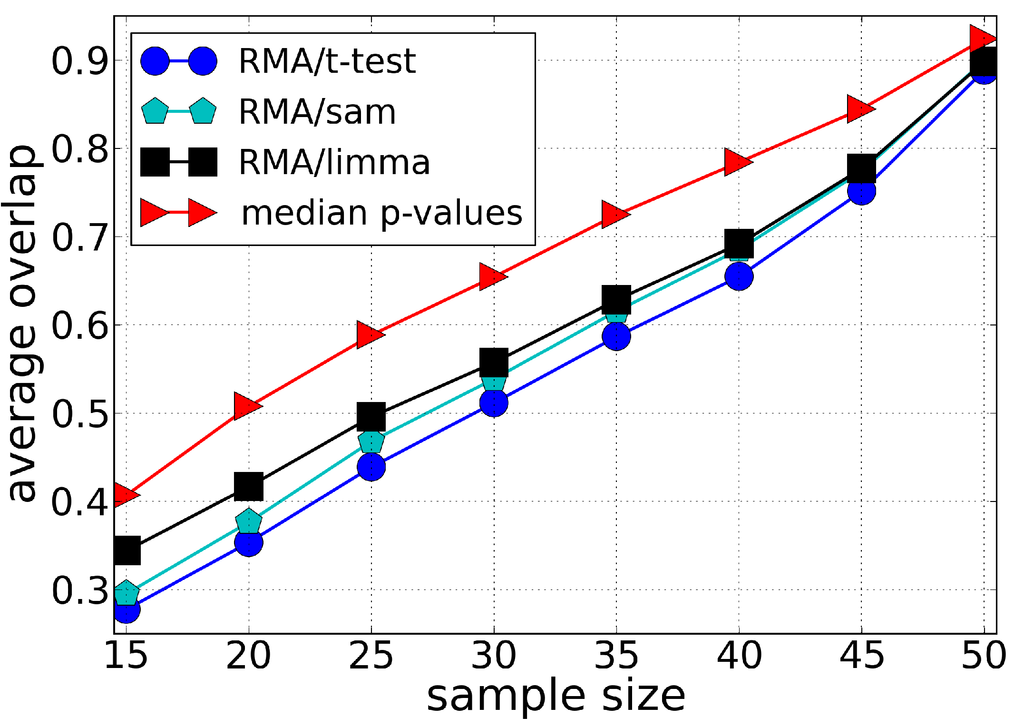 Average of the fraction of genes shared by two lists of differentially expressed genes (overlap) as a function of the sample size using the Leukemia dataset. Each list of differentially expressed genes is composed by the top 100 genes chosen according to different ranking methods, i.e., t-test, SAM and LIMMA (preprocessed by the RMA method), and our approach (median t-value) which does not require a preprocessing algorithm. The average value of the overlap between the lists is calculated over 100 lists chosen randomly.