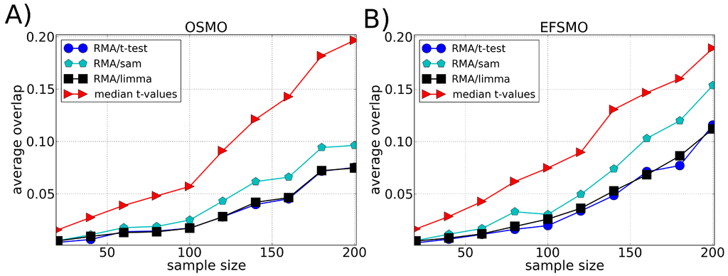 Average of the fraction of genes shared by two lists of differentially expressed genes (overlap) as a function of the sample size using the Multiple Myeloma dataset divided according to (A) Overall Survival Milestone Outcome (OS-MO) and (B) Event Free Survival Milestone Outcome (EFS-MO). Each list of differentially expressed genes is composed by the top 100 genes chosen according to different ranking methods, i.e., t-test, SAM and LIMMA (preprocessed by the RMA method), and our approach (median t-value) which does not require a preprocessing algorithm. The average value of the overlap between the lists is calculated over 100 lists chosen randomly.