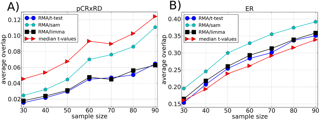 Average of the fraction of genes shared by two lists of differentially expressed genes (overlap) as a function of the sample size using the Breast Cancer dataset divided according to (A) pre-operative treatment response (pCR, pathologic complete response) and (B) estrogen receptor (ER) endpoint. Each list of differentially expressed genes is composed by the top 100 genes chosen according to different ranking methods, i.e., t-test, SAM and LIMMA (preprocessed by the RMA method), and our approach (median t-value) which does not require a preprocessing algorithm. The average value of the overlap between the lists is calculated over 100 lists chosen randomly.