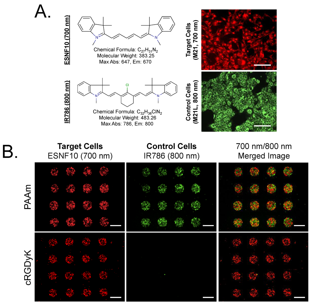 To validate the assay, integrin αvβ3-positive M21 cells (positive control) labeled with the 700 nm NIR fluorophore ESNF10 and integrin αvβ3-negative M21-L cells (negative control) labeled with the 800 nm NIR fluorophore IR786 were panned over the surface of our SMM (Figure 1A). PAAm, a “sticky” cationic polymer showing no specificity to cell surfaces was used as a positive ligand control, which bound all cell types. Using dual-channel NIR fluorescence microscopy, the number of individual cells binding each spot could be counted (Figure 1B). Thus the readout of our assay was number of cells bound per spot, with the theoretical maximum number of bound cells (i.e., the dynamic range of the assay) being defined by the PAAm control spots (≈300 cells per spot for all cell lines tested).